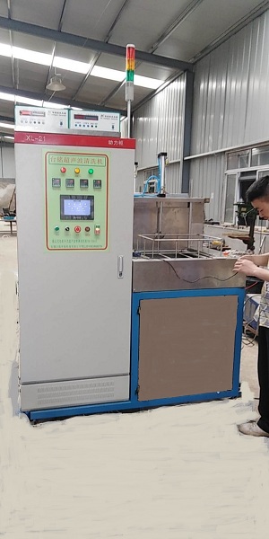 本装置为利用清洗剂作为清洗介质,在喷淋和洗剂物理化学的反应促进作用、局部的高温高圧和搅拌作用及清洗液中产生自由基等(空化作用)达到分离作用,促使污垢或颗粒从清洗物的表面上剥离,从而达到清洗的目的,清洗完毕输送至风切段进行风切、干燥;然后经过人工转入下道工序。